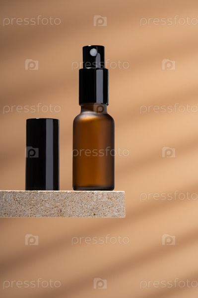 Бутылка из янтарного стекла с пустой этикеткой, крем на подставке из натурального камня на бежевом фоне. Макет натуральной органической спа-косметики. Минимальное эстетическое косметическое средство по уходу за кожей