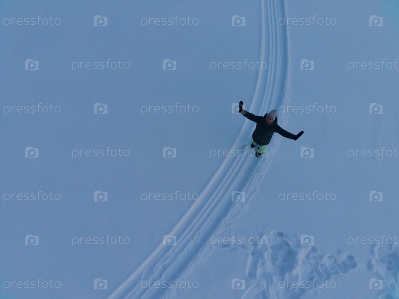 Девушка в зимней одежде на снегу, фото с высоты с квадрокоптера
