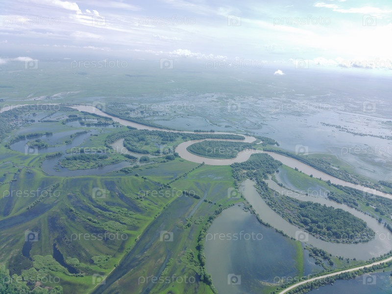 Разлив реки Чарыш, затопление полей и лугов весной. Алтайский край, Россия, Сибирь