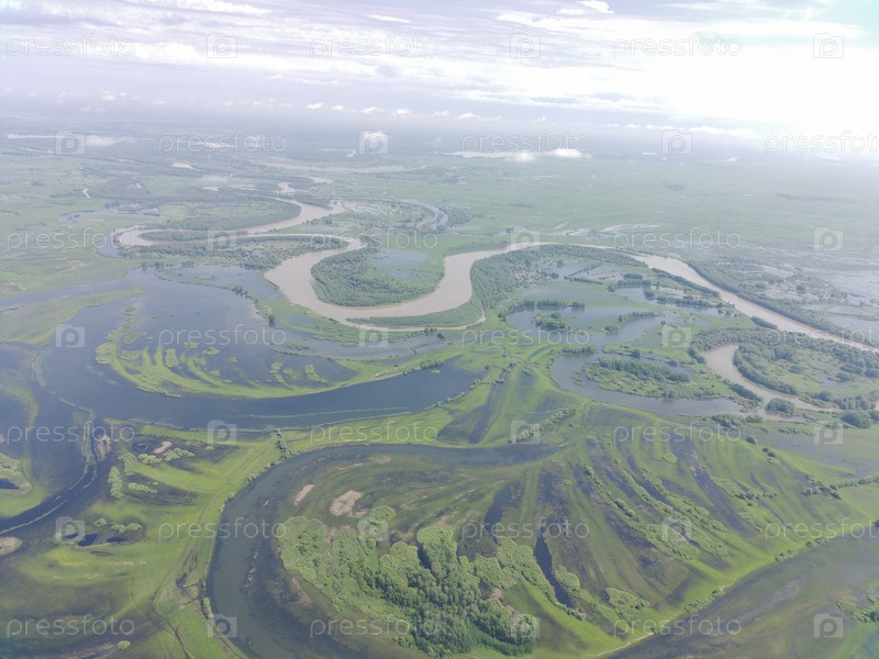 Разлив реки Чарыш, затопление полей и лугов весной. Алтайский край, Россия, Сибирь