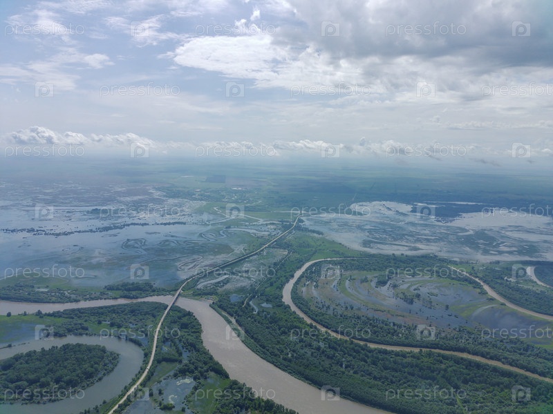Разлив реки Чарыш, затопление полей и лугов весной. Алтайский край, Россия, Сибирь. Фото с квадрокоптера