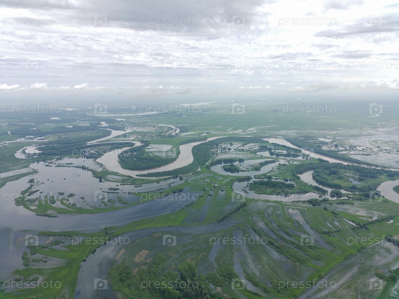 Разлив реки Чарыш, затопление полей и лугов весной. Алтайский край, Россия, Сибирь. Фото с квадрокоптера