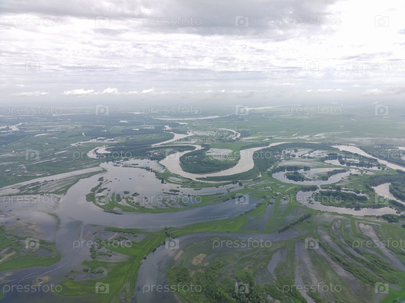 Разлив реки Чарыш, затопление полей и лугов весной. Алтайский край, Россия, Сибирь. Фото с квадрокоптера