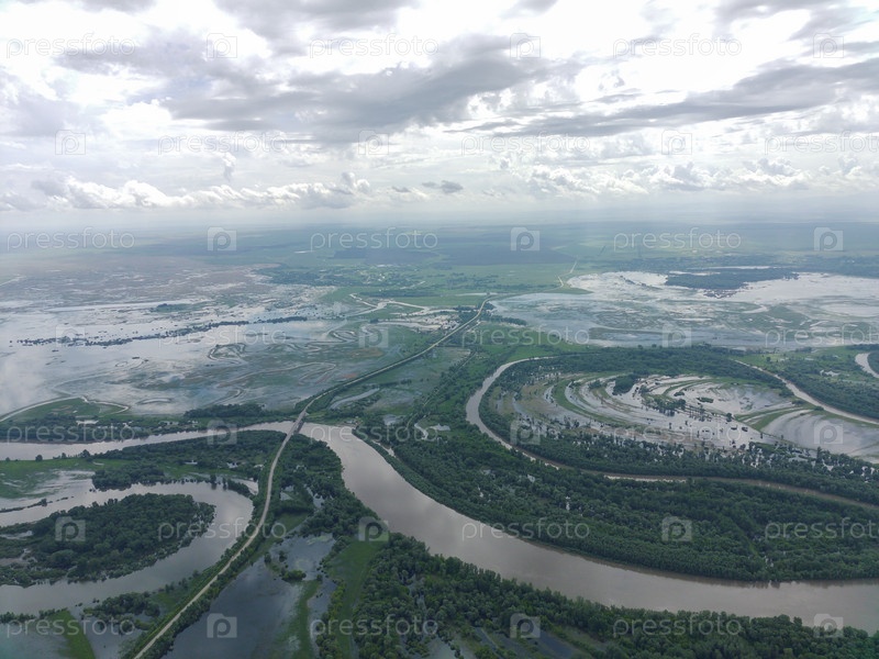 Разлив реки Чарыш, затопление полей и лугов весной. Алтайский край, Россия, Сибирь. Фото с квадрокоптера