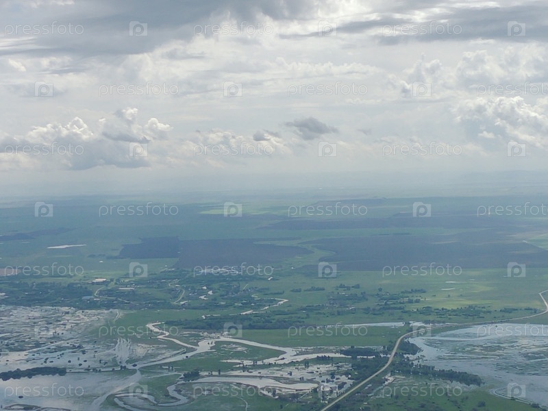 Разлив реки Чарыш, затопление полей и лугов весной. Алтайский край, Россия, Сибирь. Фото с квадрокоптера