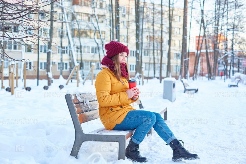Молодая женщина в шляпе и желтой куртке с одноразовым стаканчиком кофе в руках в морозный зимний день на скамейке