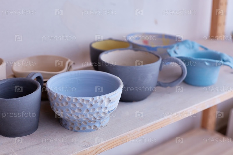 Пустая посуда ручной работы. Керамические чашки на полке. Ручная работа. Глазурь синего цвета на глине