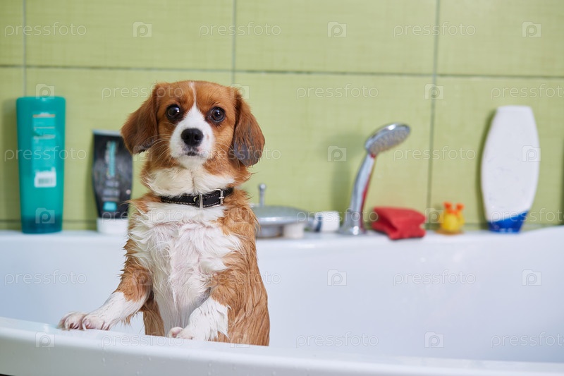 Очень милая собака, метис рыжий с белым, принимает ванну