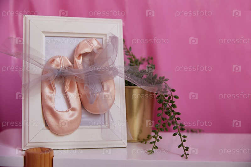 Картина с розовыми детскими пинетками и цветком на полке в комнате. Дизайн интерьера