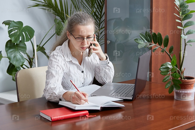 Деловая женщина в очках разговаривает по телефону за ноутбуком и пишет в блокноте