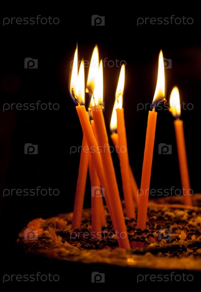 Зажженные свечи в церкви на черном фоне