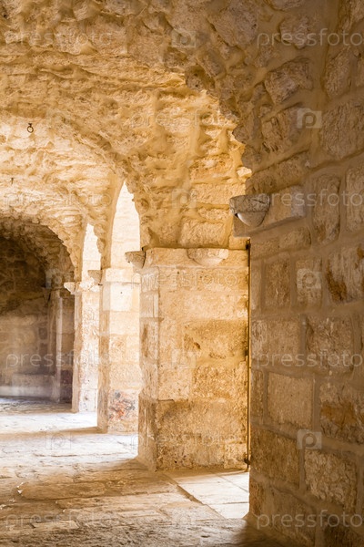 Красивая кирпичная каменная арка с уходящей вниз тропой в церкви в Иерусалиме