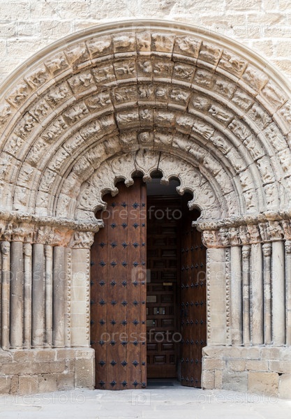 Подробная каменная арка и деревянные двери исторической церкви в Обаносе, Испания