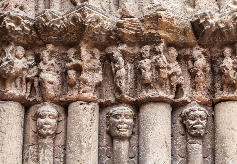 Подробная резьба по камню с изображениями фигур и лиц украшает древние колонны в Обаносе, демонстрируя богатое художественное наследие