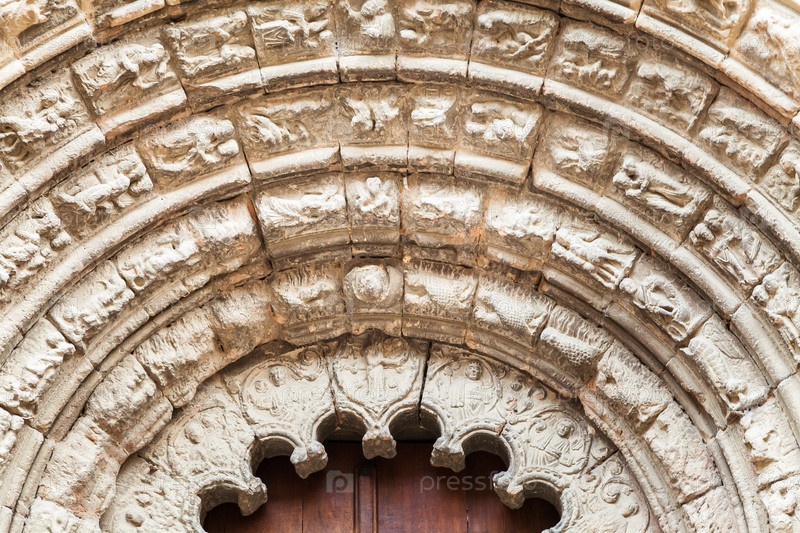 Великолепно вырезанный каменный свод обрамляет большие деревянные двери старинной церкви в Обаносе, демонстрируя изысканное мастерство