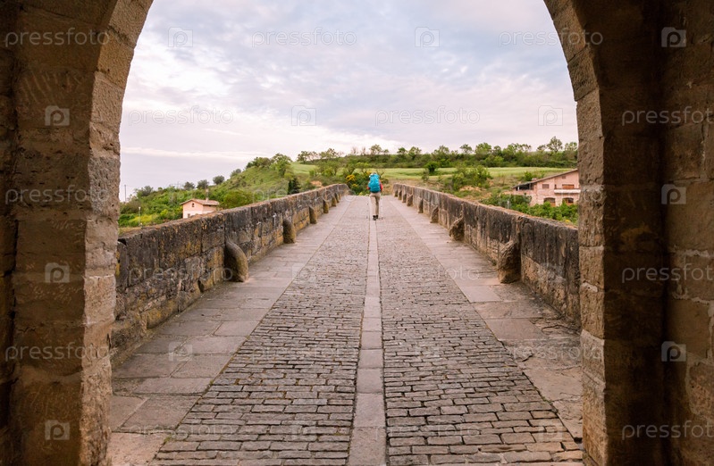 Путешественник идет в одиночестве по историческому каменному мосту в Обаносе, Испания, на лоне природы