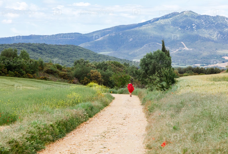 Одинокая фигура прогуливается по грунтовой тропе, окруженной пышной зеленью, на фоне гор под ясным небом