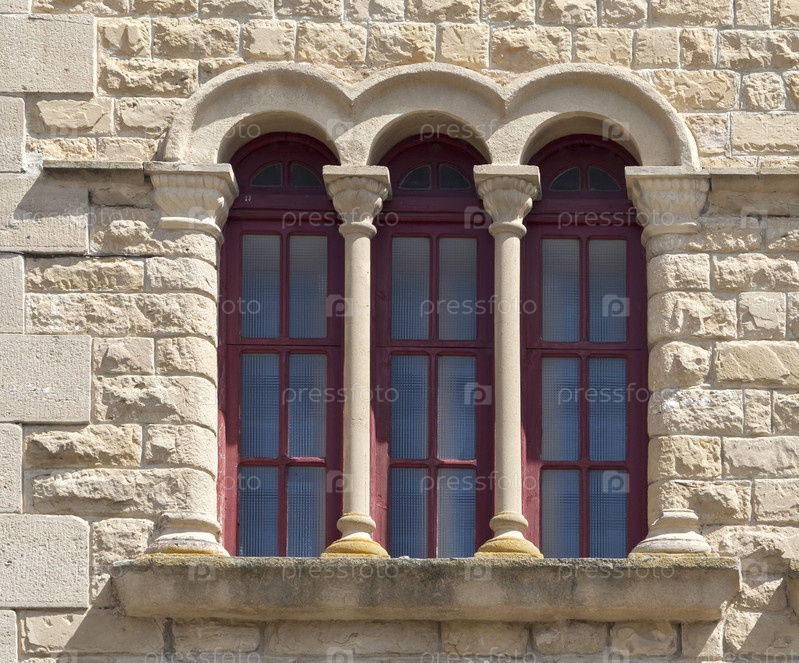 Декоративное каменное окно с колоннами в историческом здании