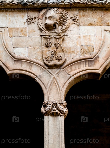 Изысканная каменная кладка с изображением лица и цветочными мотивами украшает колонну в историческом месте Саламанки