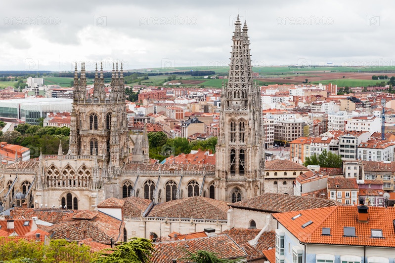 Бургосский собор величественно возвышается над крышами города, окруженный пышной зеленью и зданиями под серым небом