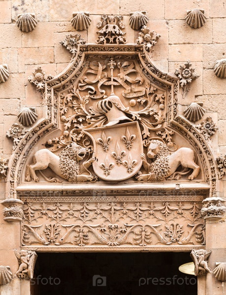 Изысканная резьба по камню с изображением львов и герба в историческом здании в Саламанке, Испания