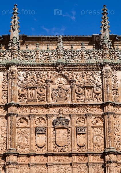 Изысканные каменные узоры и королевские символы украшают экстерьер исторического Университета Саламанки, демонстрируя его архитектурную красоту