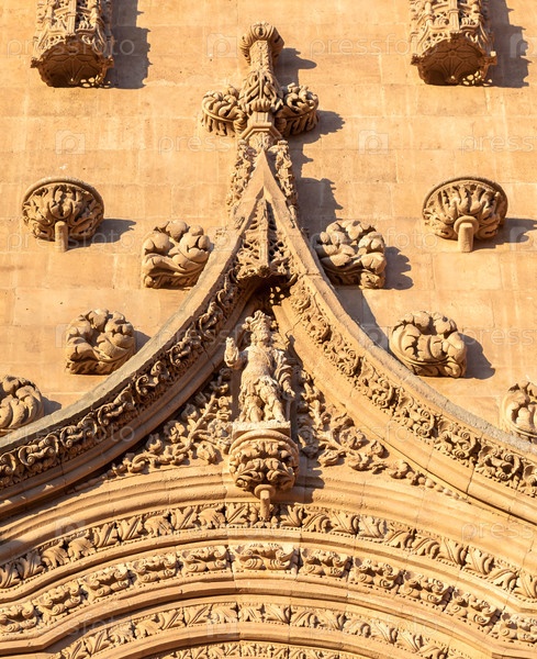 Детальная резьба по камню подчеркивает архитектурную красоту исторического здания Саламанки в теплом вечернем свете