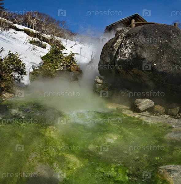 Россия. Курильские острова. Лучший из термальных источников (Кипящая река) у вулкана Барановского имеет живописный ярко-изумрудный цвет. Температура воды в ваннах достигает 40 градусов