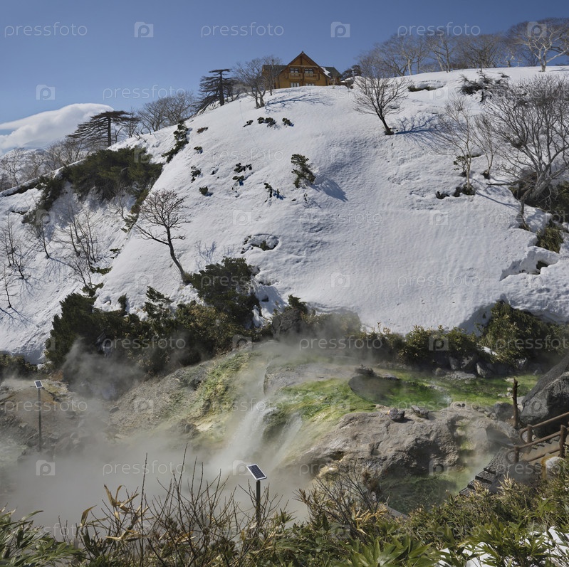 Россия. Курильские острова. Лучший из термальных источников (Кипящая река) у вулкана Барановского имеет живописный ярко-изумрудный цвет. Температура воды в ваннах достигает 40 градусов