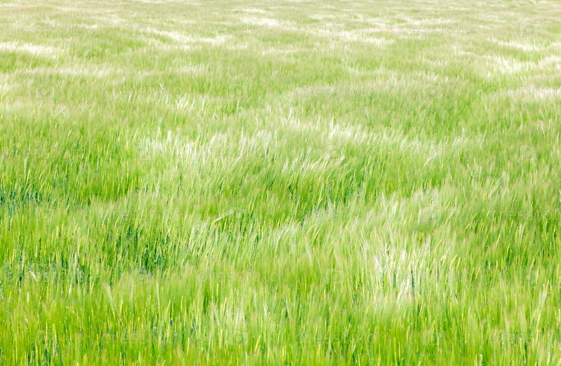 Пышное поле зеленой травы мягко колышется на ветру, освещенное солнечным светом в ясный день, демонстрируя красоту природы