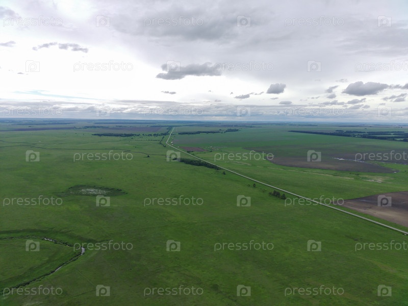 Съемка с квадрокоптера. Поля и луга уходят за горизонт. Алтайский край. Россия