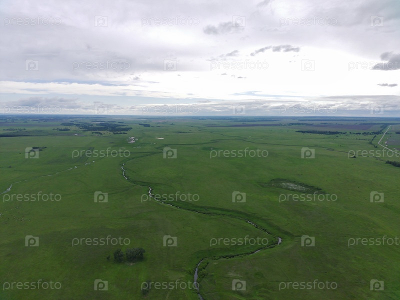 Съемка с квадрокоптера, речка, поля и луга летом уходят за горизонт. Алтайский край, Россия