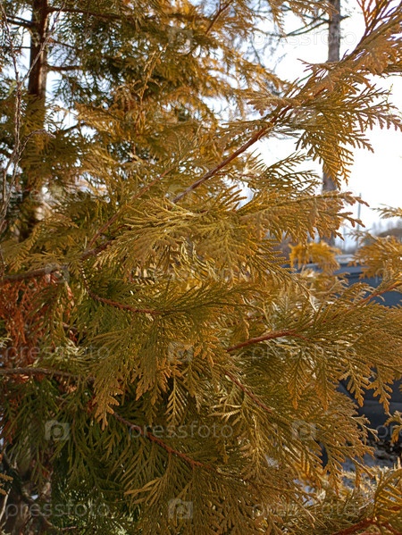 Желто-зеленые ветки туи зимой, природный фон