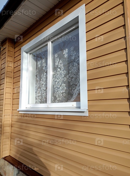 Окно с белым ажурным тюлем в сельском доме, вид с улицы в солнечный зимний день