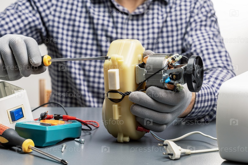 Мужчина ремонтирует бытовую технику. малый бизнес