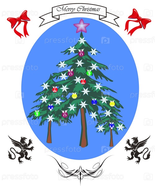 Рождественская праздничная ель на синем фоне, украшенная узорами