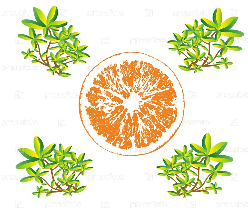 Сочный и свежий кусочек апельсина с зелеными листьями на белом фоне
