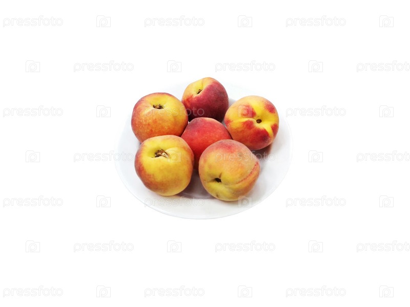 Тарелка с сочными сладкими персиками на белом фоне