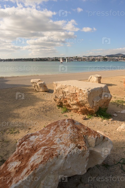 Большие скалы, спокойная вода и город