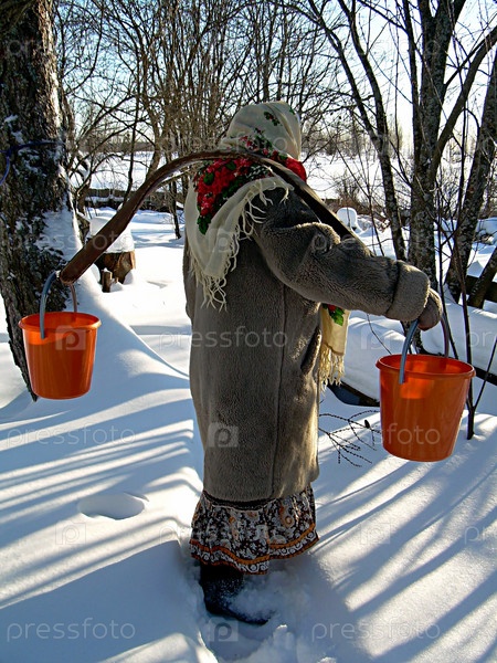 Пожилая женщина с коромыслом и ведрами