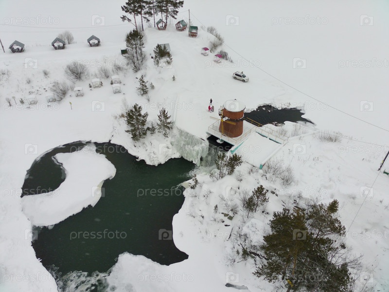 Карпысакский водопад, Тогучинский район, Новосибирская область, Сибирь, Россия. Пейзаж с высоты