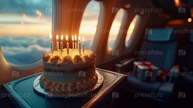 Крупный план праздничного торта со свечами на складном столике-подносе для самолета. На заднем плане — современный салон самолета с мягким рассеянным освещением и окном, через которое видны облака и голубое небо