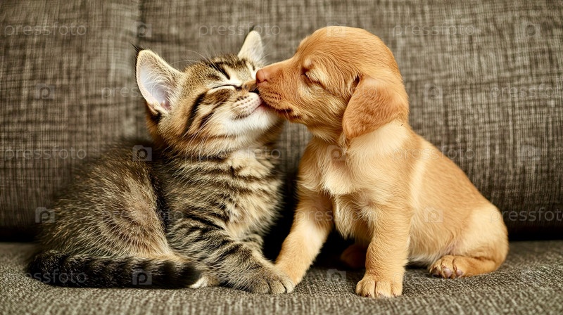 Очаровательный котенок и рыжий щенок сидят на коричневом диване, день поцелуя и концепция Дня святого Валентина