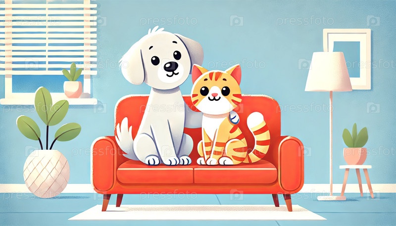 Счастливый белый щенок обнимает своего друга рыжего кота, сидя на красном диване в светло-голубой комнате