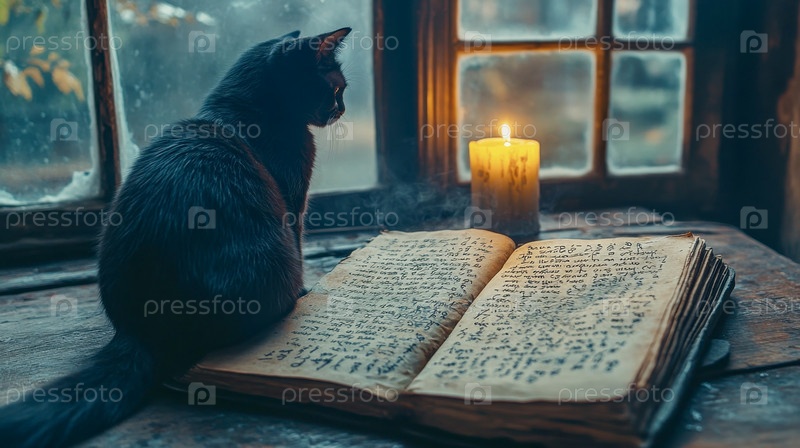 Черный кот сидит на старом деревянном столе возле окна. На столе горит свеча и открытая магическая книга