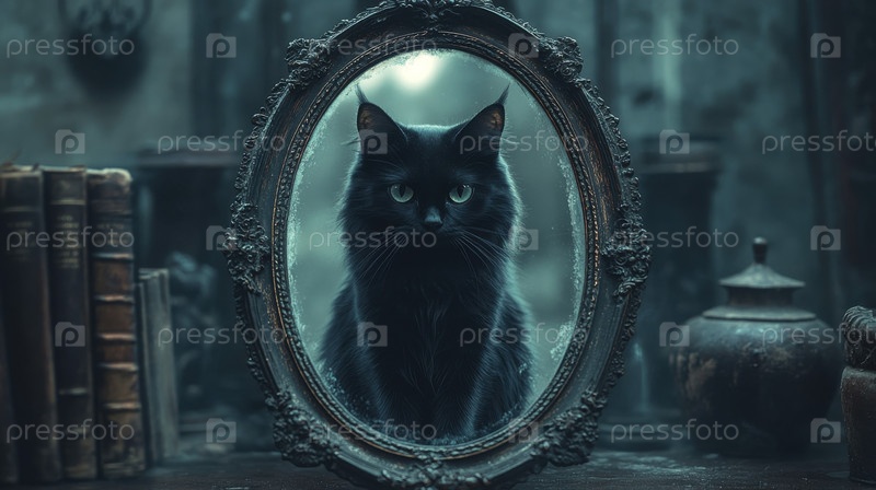 Отражение черного кота в старинном зеркале, стоящем на столе среди старых пыльных книг