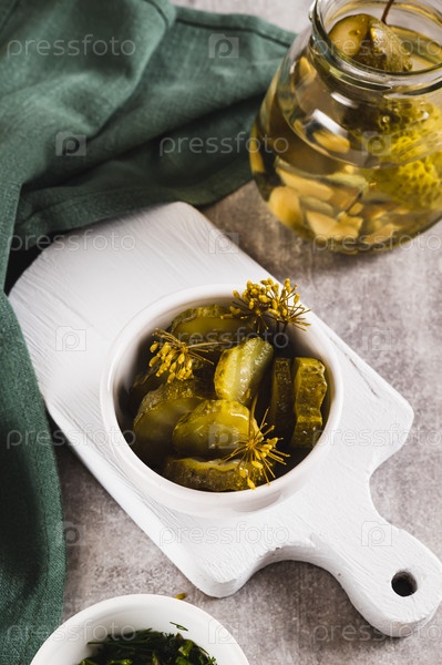 Кусочки соленых огурцов с укропом в миске на столе вертикальный вид