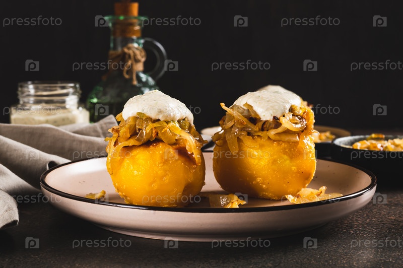 Запеченный картофель с жареным луком и соусом ранч на тарелке на столе