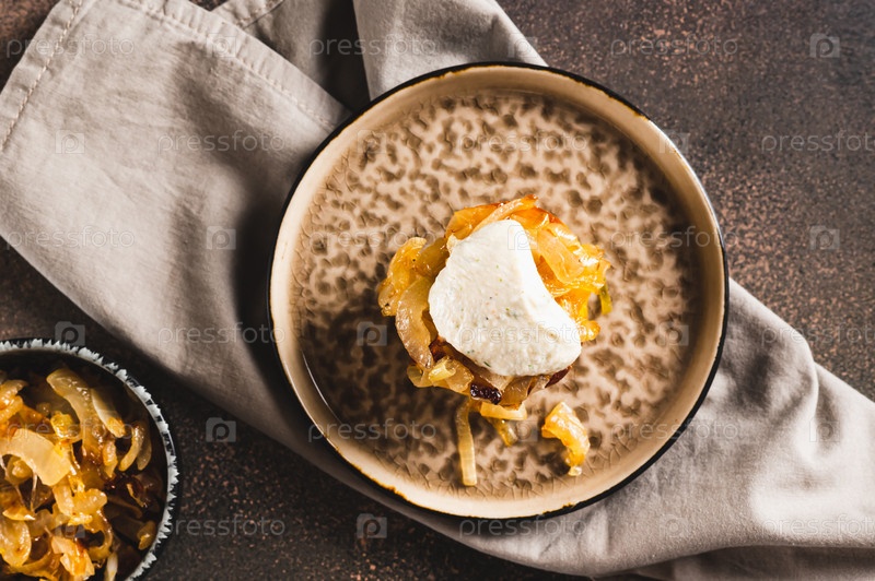 Крупный план печеного картофеля с жареным луком и соусом ранч на тарелке, вид сверху