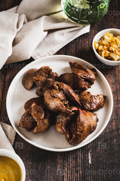 Домашняя тушеная куриная печень на тарелке на столе вертикальный вид